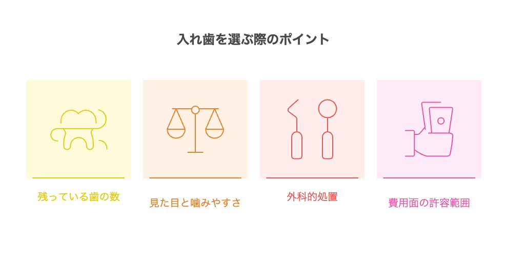 入れ歯選びでは、種類だけでなく、複数の視点から整理することが大切です。