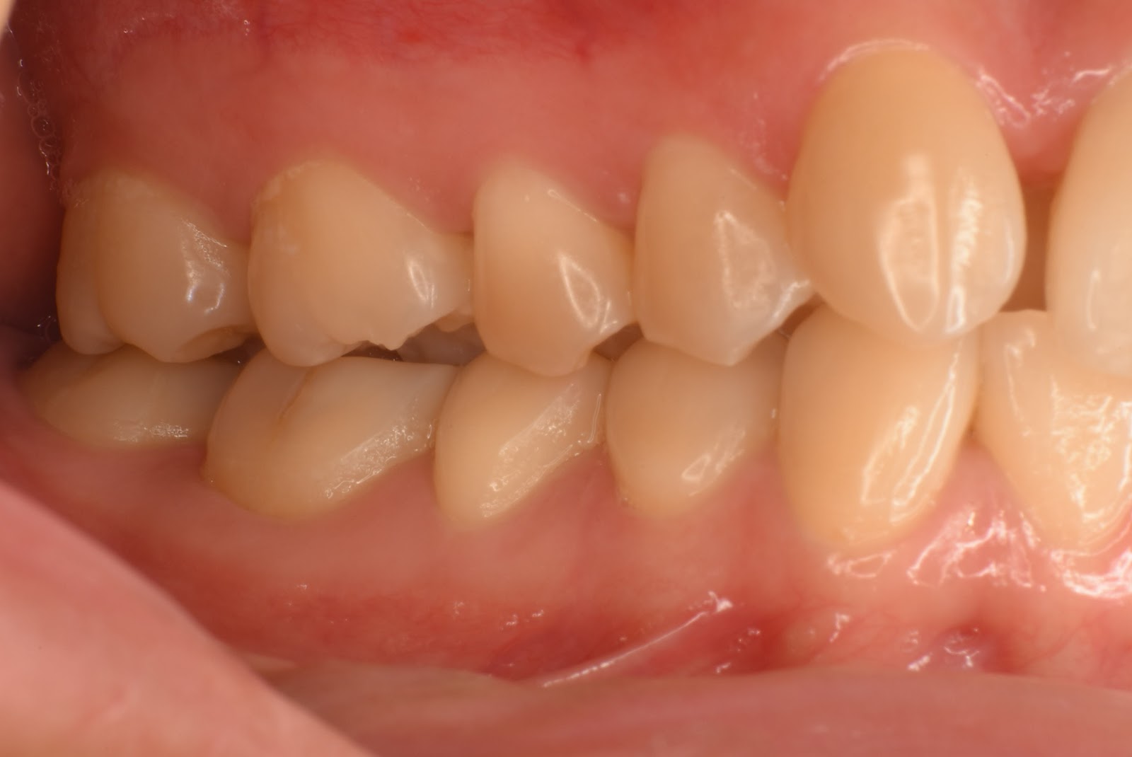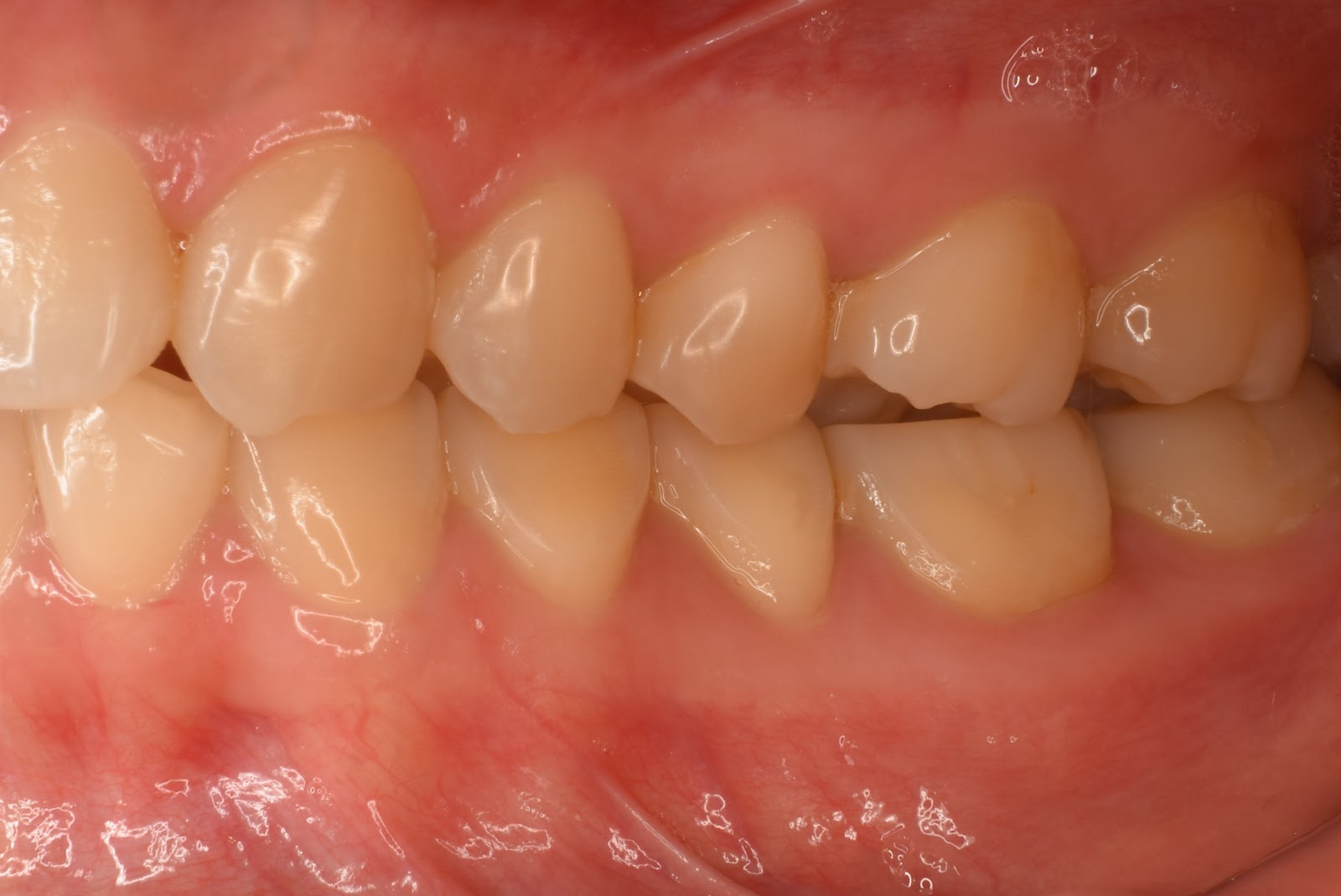 上の前歯が一本内側に入っているのが気になる。磨きにくい。全体的に歯のすり減りも気になっている。